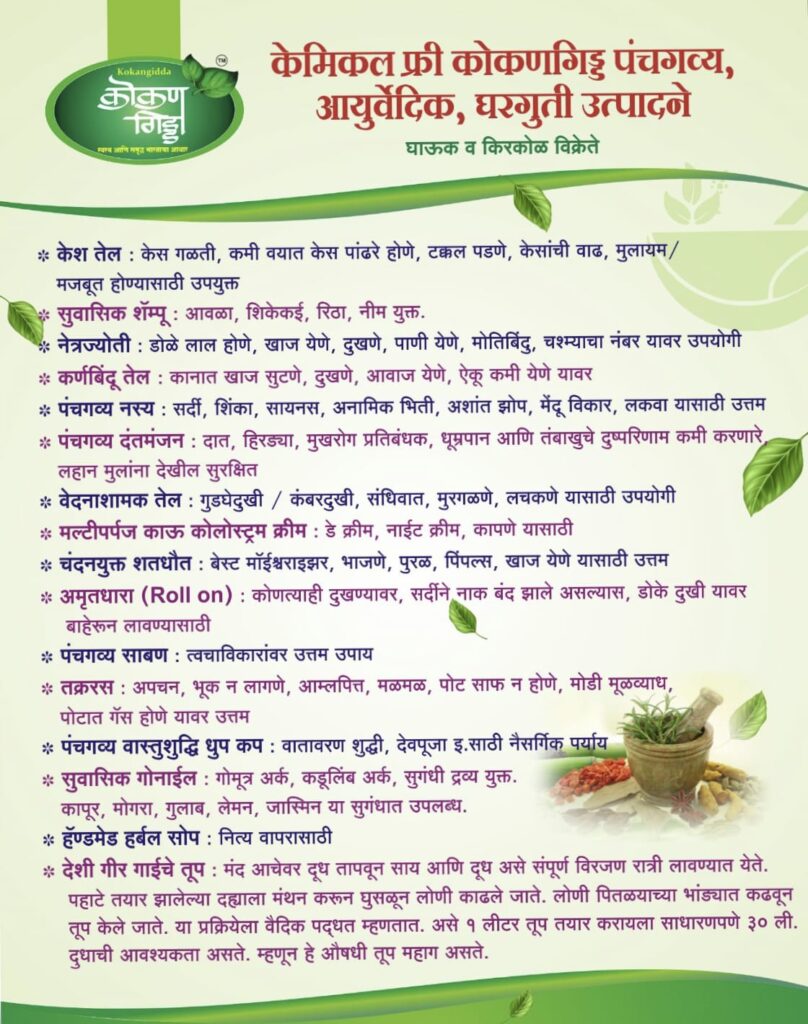 ही उत्पादने 100% खात्रीची भारतीय वंशाची स्थानिक देशी प्रजाती कोकण कपिला या गाईच्या दूध, दही, ताक, तूप, गोमूत्र, गोमय इत्यादींपासून बनलेली आहेत.